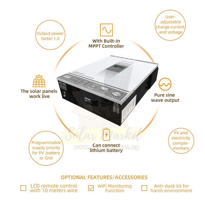 Compact and high-performance inverter with 12V battery support, MPPT solar charging, and pure sine wave output. Offers 1500W rated and 3000W peak power. Suitable for small homes, offices, and backup systems.