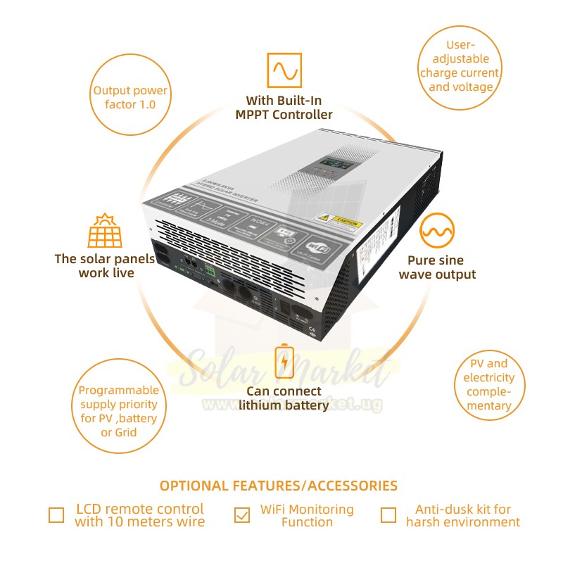 The Entelechy 6.2KW Solar Hybrid Inverter BST-HP-6200W is designed for demanding solar energy systems. Delivering 7500VA/6200W of continuous power and 10000W surge capacity, it supports both residential and commercial applications. This inverter features an advanced MPPT charge controller, 48VDC battery system, and a high-efficiency pure sine wave output. It allows for dual-source charging (solar + AC), ensuring reliability and flexibility in all weather conditions.
