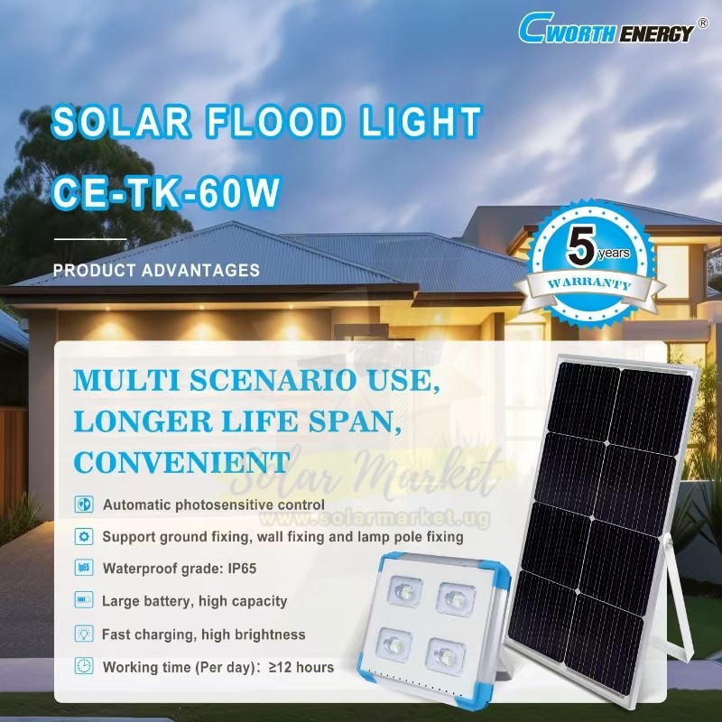 Illuminate streets and public areas efficiently with the 60W TK-60W street light. This environmentally friendly lighting solution combines high-performance solar technology with easy installation, perfect for enhancing visibility and safety in urban and rural environments across Uganda.